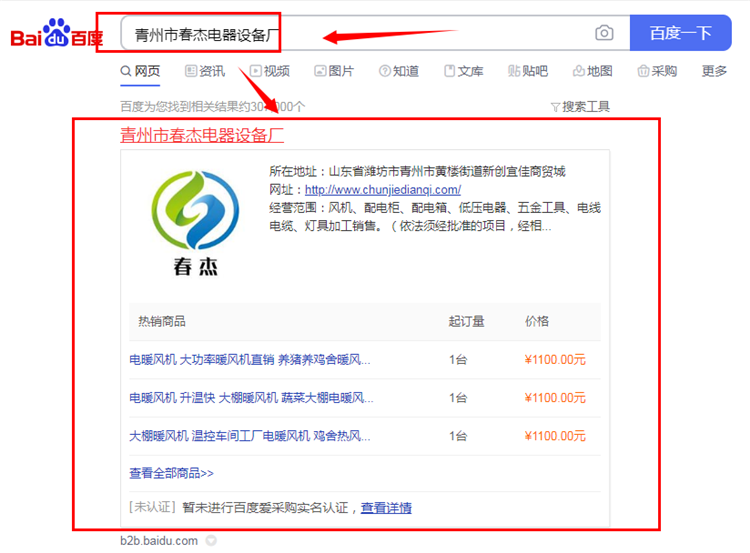 百度搜索公司全稱:“青州市春杰電器設(shè)備廠”,即可看到超大企業(yè)名片,幫助商家打造品牌,提升知名度,提升潛在客戶轉(zhuǎn)化率。