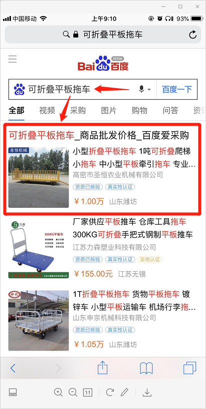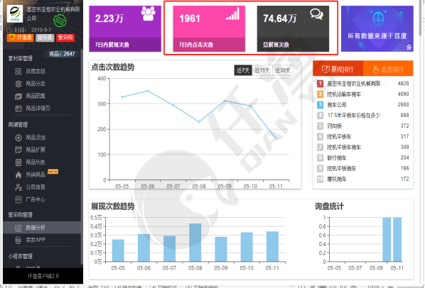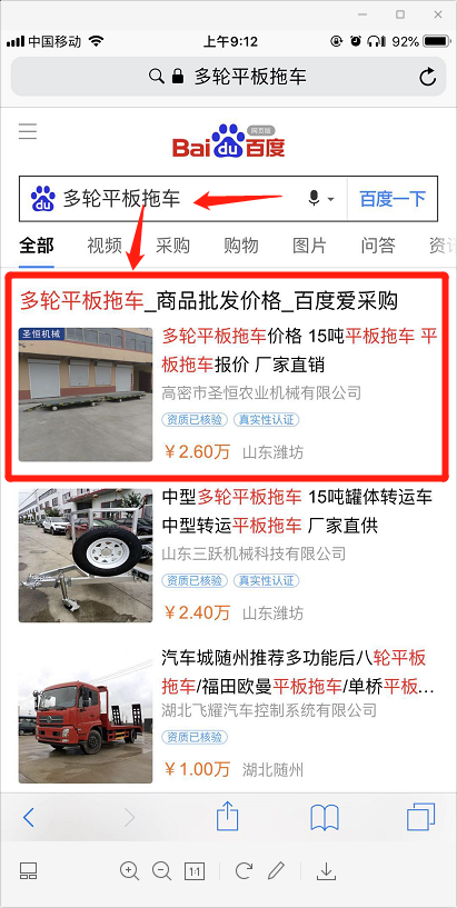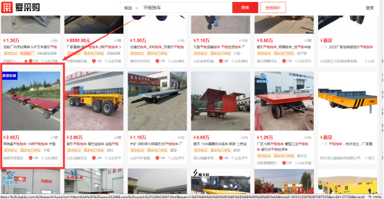 高密市圣恒農業(yè)機械有限公司,山東專業(yè)生產平板拖車、農用拖車、箱式拖車的公司,大量的關鍵詞獲得百度愛采購首頁排名,現(xiàn)在大部分詞首頁展現(xiàn),pc端和手機端同步全天展現(xiàn),后臺大量詢盤,提高成交率,現(xiàn)在仟漁推出百度愛采購競價,百度首頁固定展現(xiàn)???。百度推出百度愛采購賣家版,手機app形式,后臺數(shù)據(jù)一鍵掌握。手機app與客戶詢盤無縫連接,客戶信息無一遺漏。