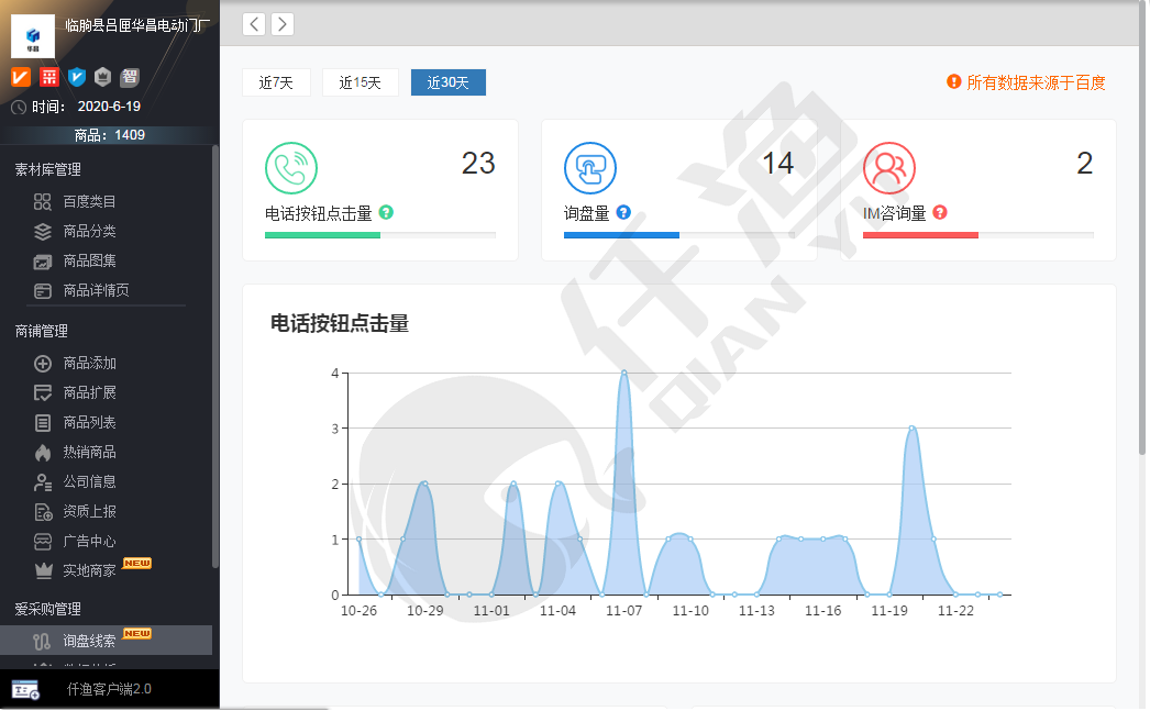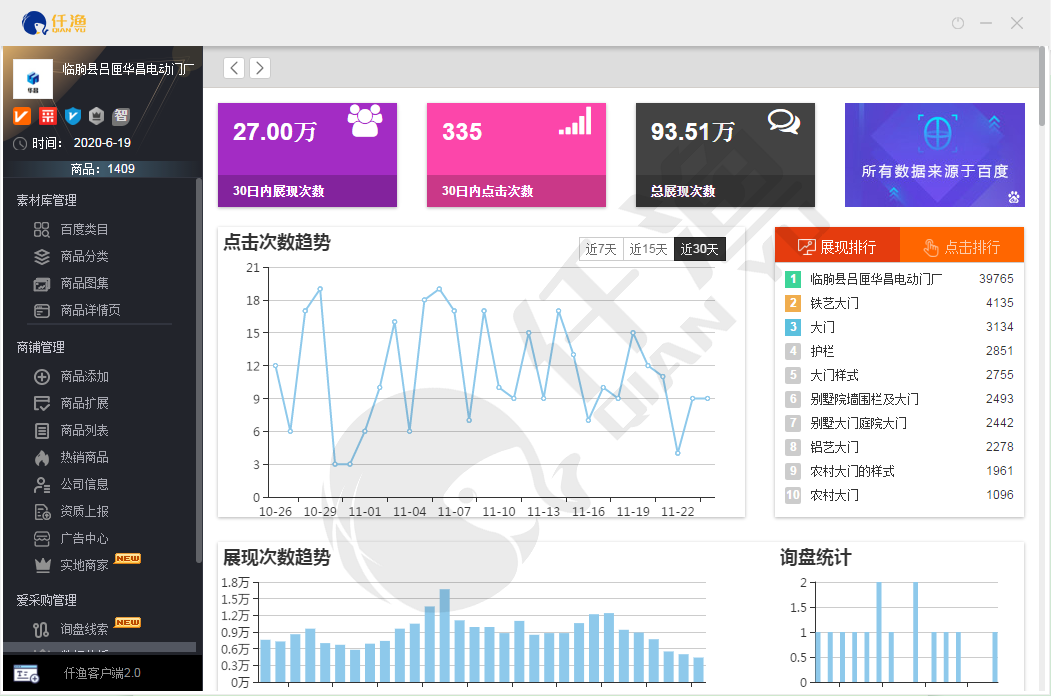 臨朐縣呂匣華昌電動門廠,山東專業(yè)生產(chǎn)鐵藝大門,鐵藝護(hù)欄,鋁藝大門,鋁藝護(hù)欄的公司,大量的關(guān)鍵詞獲得百度愛采購首頁排名,現(xiàn)在大部分詞展現(xiàn)良好,pc端和手機(jī)端同步全天展現(xiàn),后臺大量詢盤,提高成交率,現(xiàn)在仟漁推出百度愛采購競價,百度首頁固定展現(xiàn)???。百度推出百度愛采購賣家版,手機(jī)app形式,后臺數(shù)據(jù)一鍵掌握。手機(jī)app與客戶詢盤無縫連接,客戶信息無一遺漏。