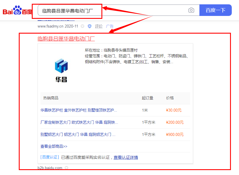 百度搜索公司全稱:“臨朐縣呂匣華昌電動門廠”,即可看到超大企業(yè)名片,幫助商家打造品牌,提升知名度,提升潛在客戶轉(zhuǎn)化率。