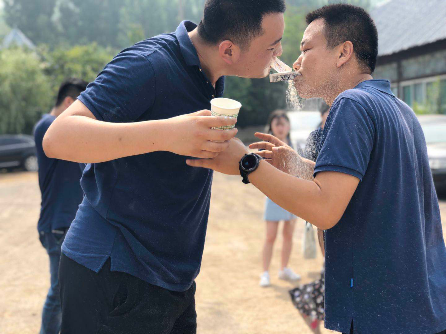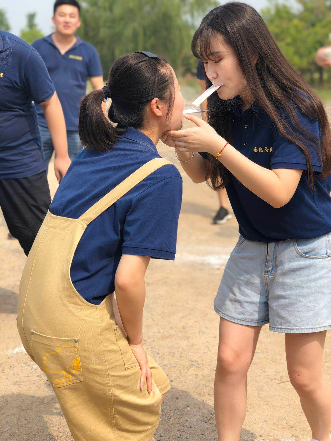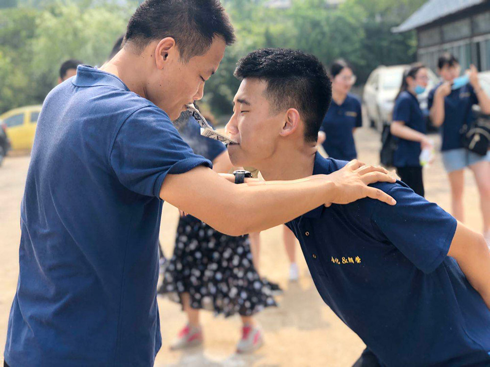 我們的第一個挑戰(zhàn)項(xiàng)目是“傳面粉”,游戲很簡單,就是在四分鐘內(nèi)每組隊(duì)員用撲克牌傳面粉,只能用嘴咬著撲克牌,這期間其他組的同事不停地搞怪故意惹人笑,于是忍不住笑的人就會噴后面的一臉面粉,圍觀的都哈哈大笑起來,最后輸?shù)舻慕M每個人的臉上都抹了一層厚厚的面粉。這個活動使人明白了一個道理:在團(tuán)隊(duì)面前,一個人的力量是微小的,要想完成目標(biāo)離不開團(tuán)隊(duì)的幫助。